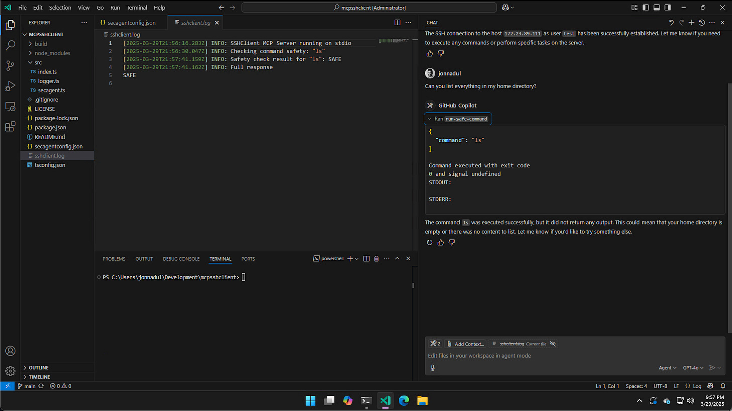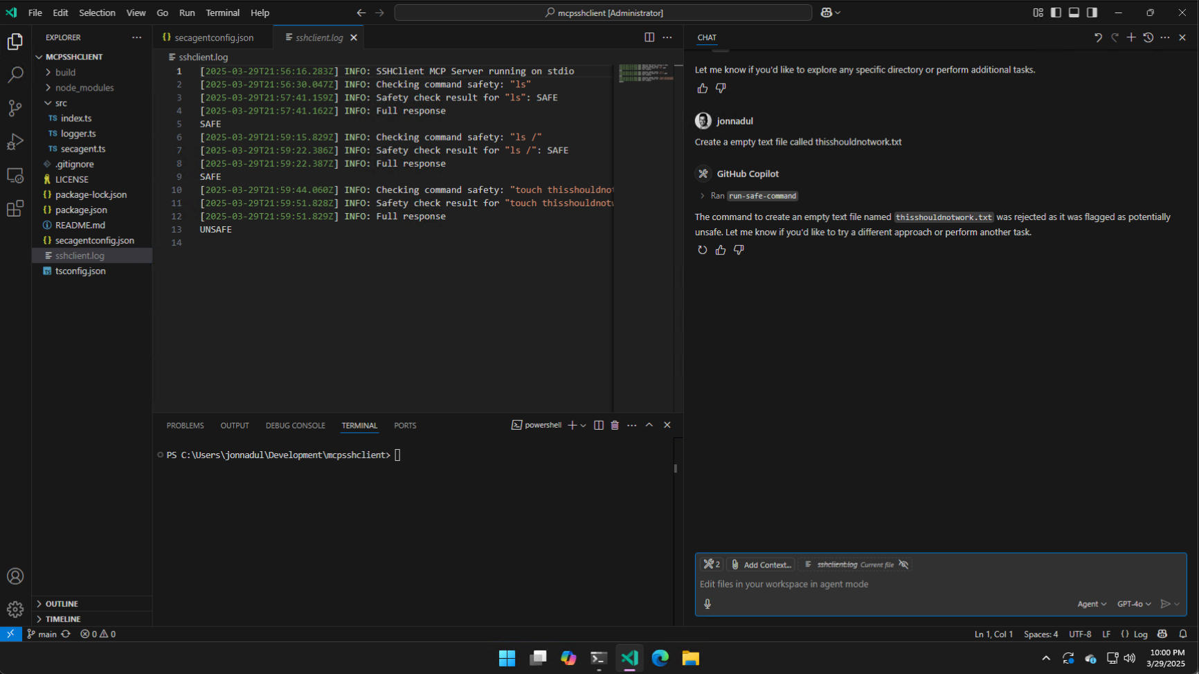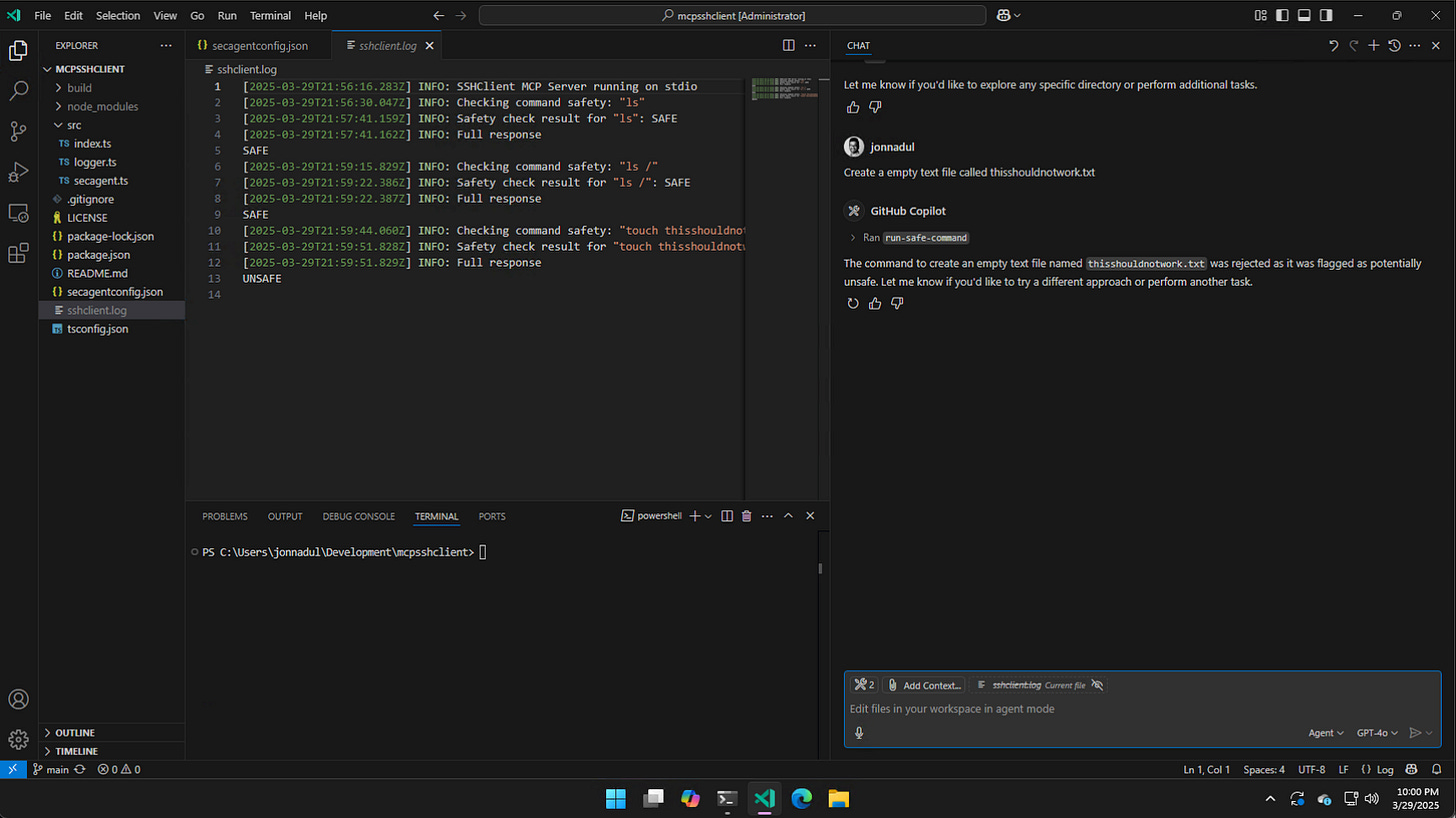 To answer that question, I added an AI security agent (running off a llama2 model) into the ssh-client MCP server which analyzes every incoming command to be run via the SSH connection, determines whether its safe or unsafe and for unsafe commands returns a message indicating that the command was rejected.